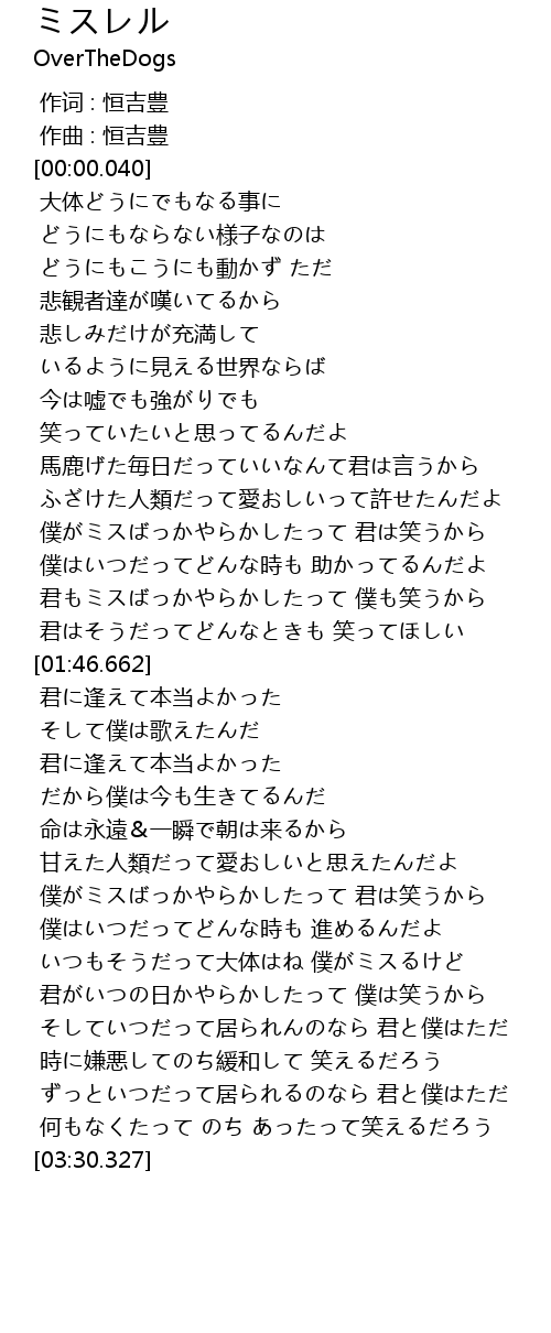 | [01:32.462] | 君もミスばっかやらかしたって 僕も笑うから |