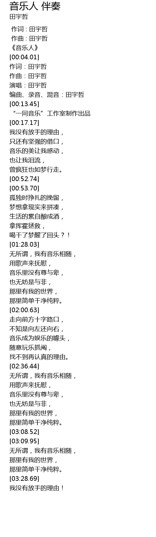 | [00:11.26] | 编曲、录音、混音:田宇哲 |