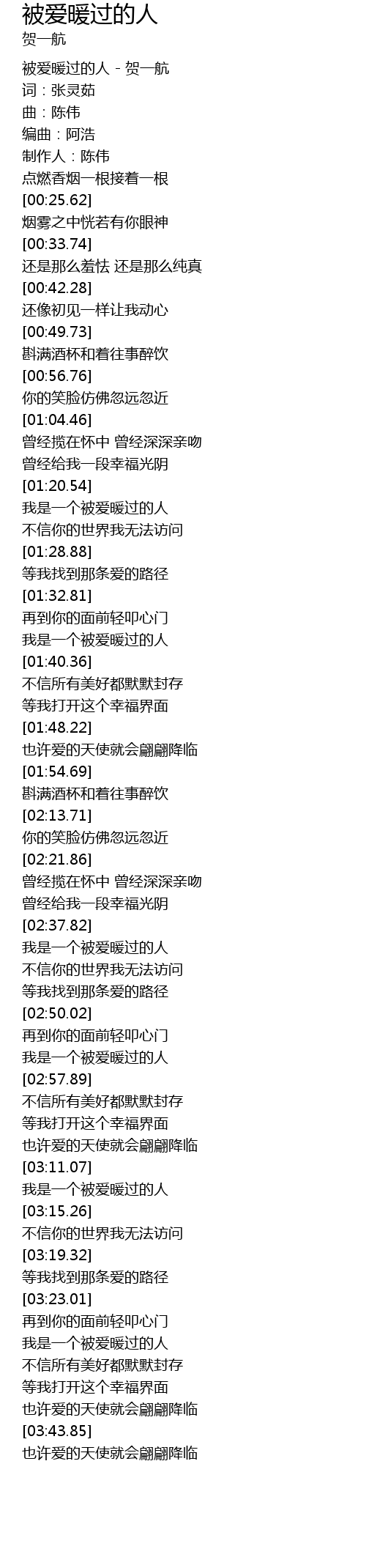 | [00:00.00] | 被爱暖过的人 - 贺一航 |