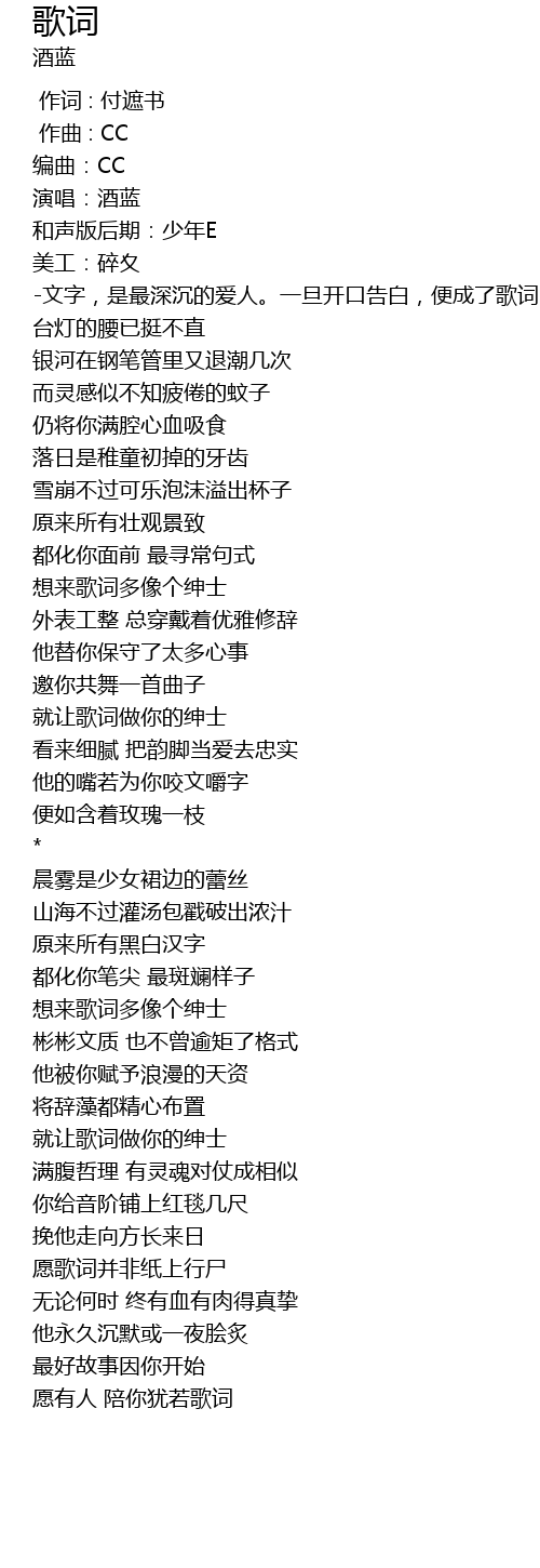 | [00:08.00] | -文字,是最深沉的爱人。一旦开口告白,便成了歌词。 |