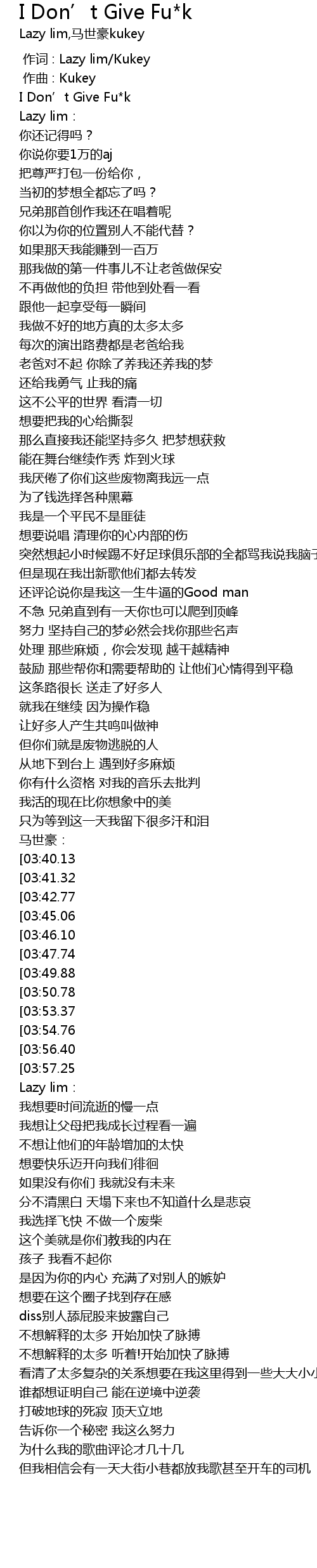 | [04:14.13][03:54.76][02:37.71][02:18.60] | i don' t give a f ck ! |