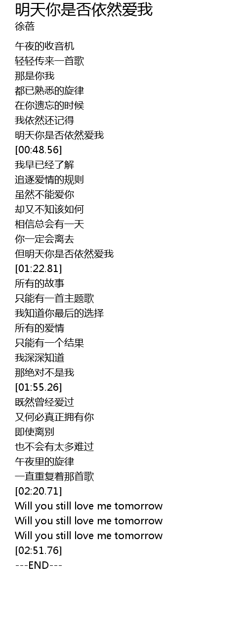 | [00:43.16] | míng tiān nǐ shì fǒu yī rán ài wǒ |
