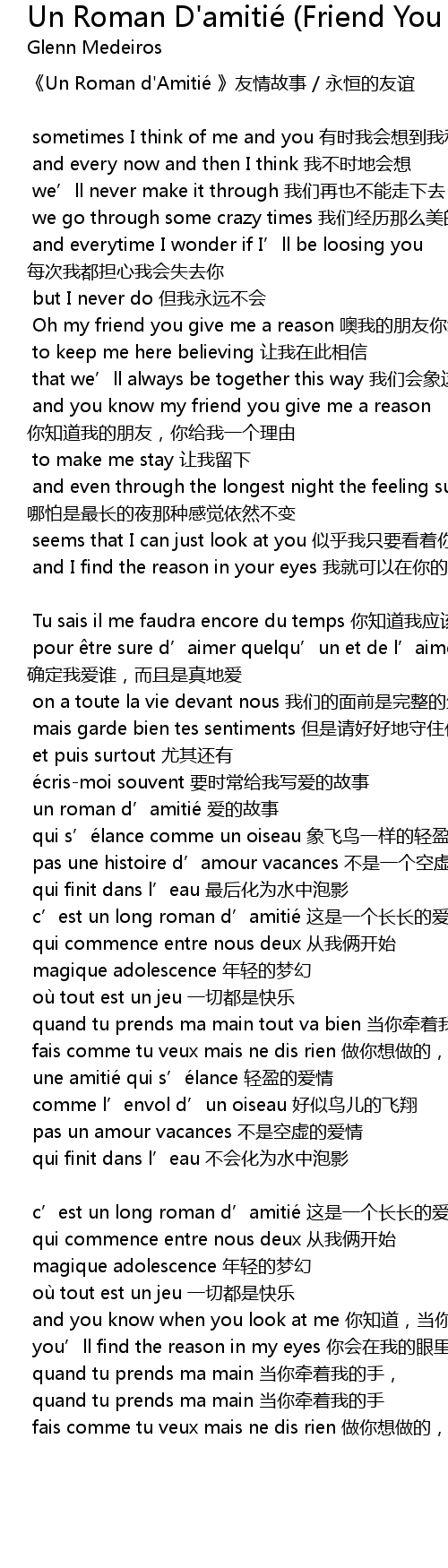 | Oh my friend you give me a reason o wo de peng you ni gei wo yi ge li you | |