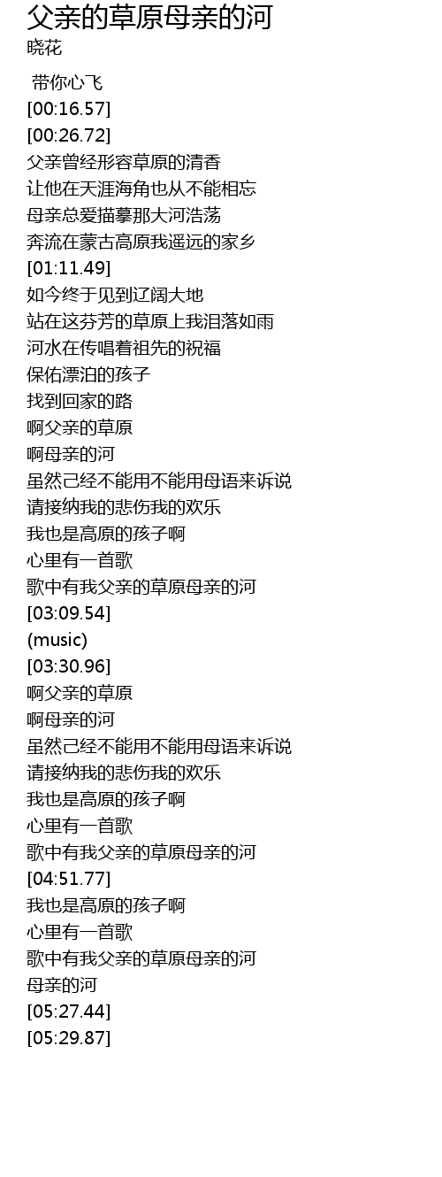 | [05:04.80] | gē zhōng yǒu wǒ fù qīn de cǎo yuán mǔ qīn de hé |