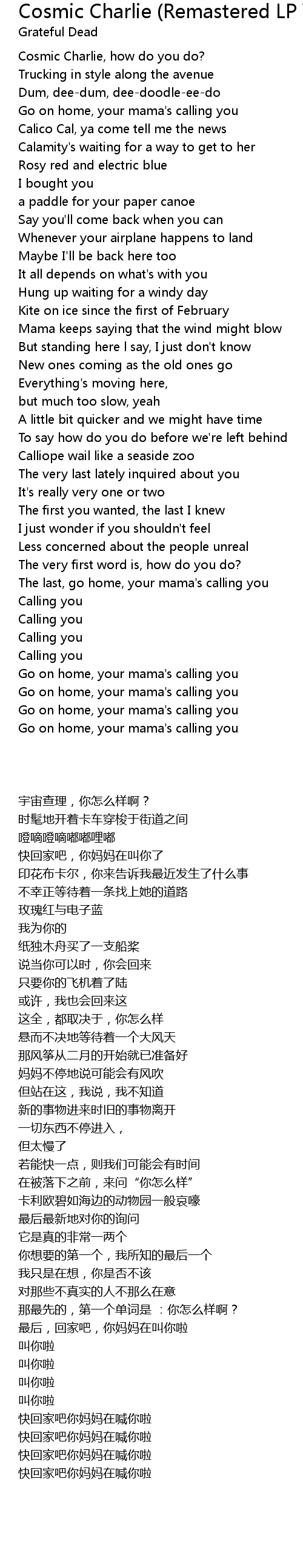 | [00:23.435] | Cosmic Charlie, how do you do? |