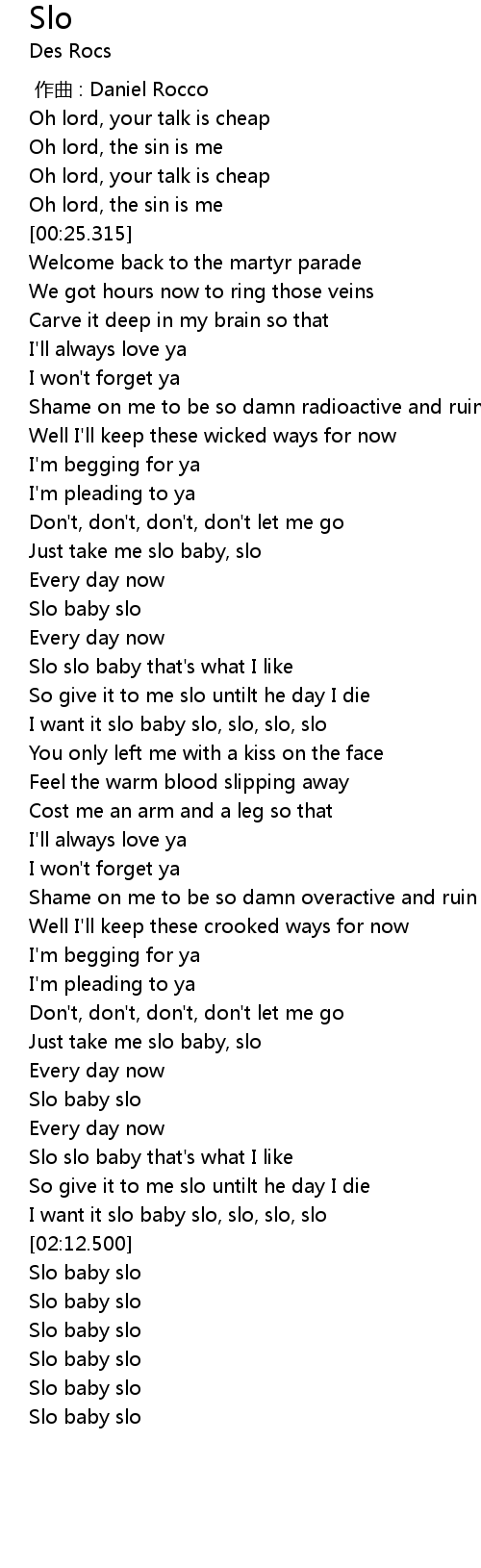 | [02:06.017] | I want it slo baby slo, slo, slo, slo |