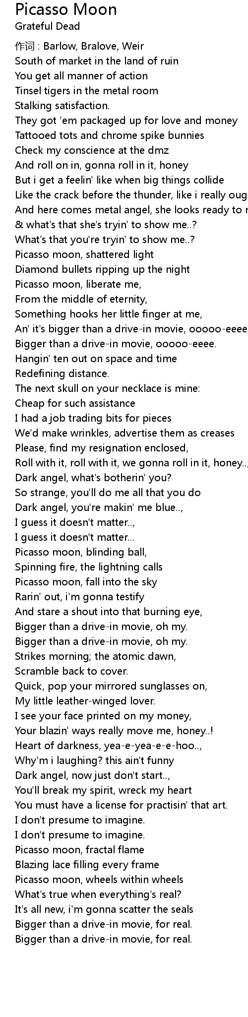 | Picasso moon, liberate me, | |