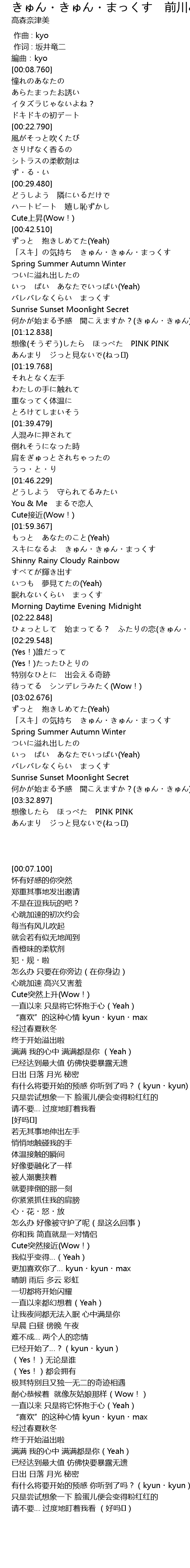 | [02:22.967] | ひょっとして 始まってる? ふたりの恋(きゅん・きゅん) |