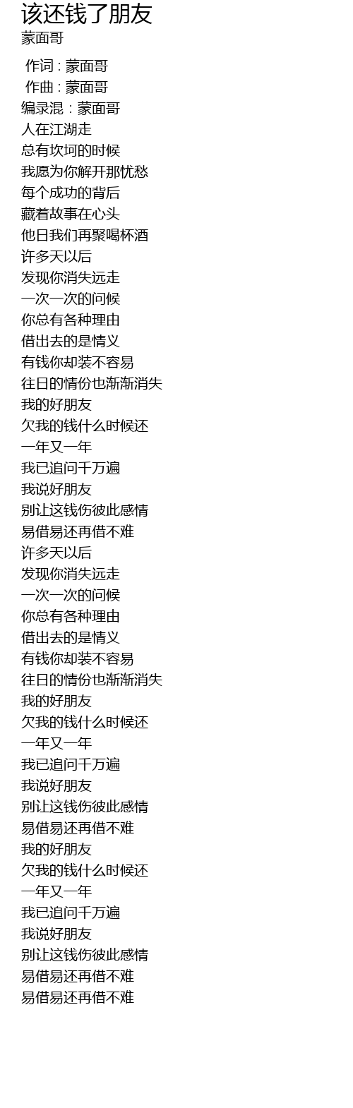 | [01:41.62] | 别让这钱伤彼此感情 |