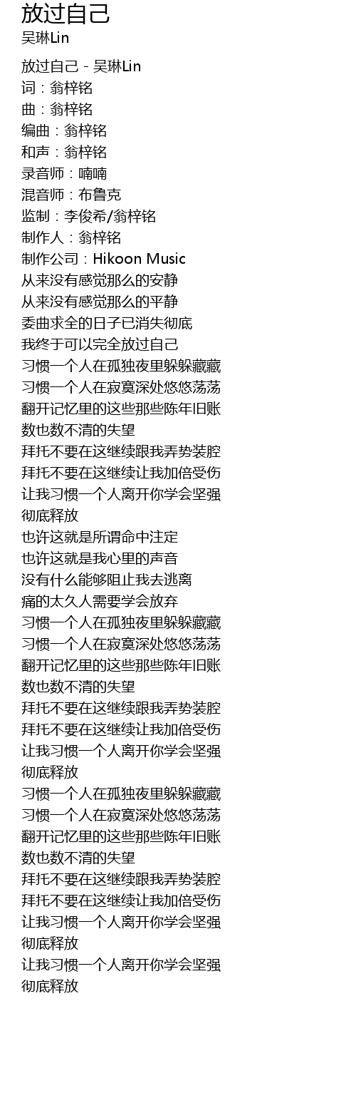 | [00:00.46] | 放过自己 - 吴琳Lin |