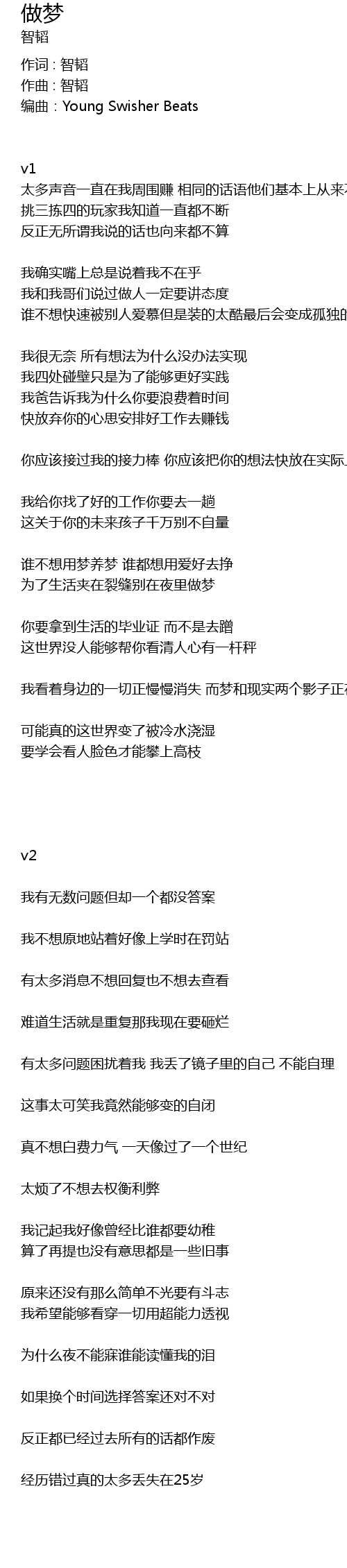 | 谁不想用梦养梦 谁都想用爱好去挣 为了生活夹在裂缝别在夜里做梦 | |