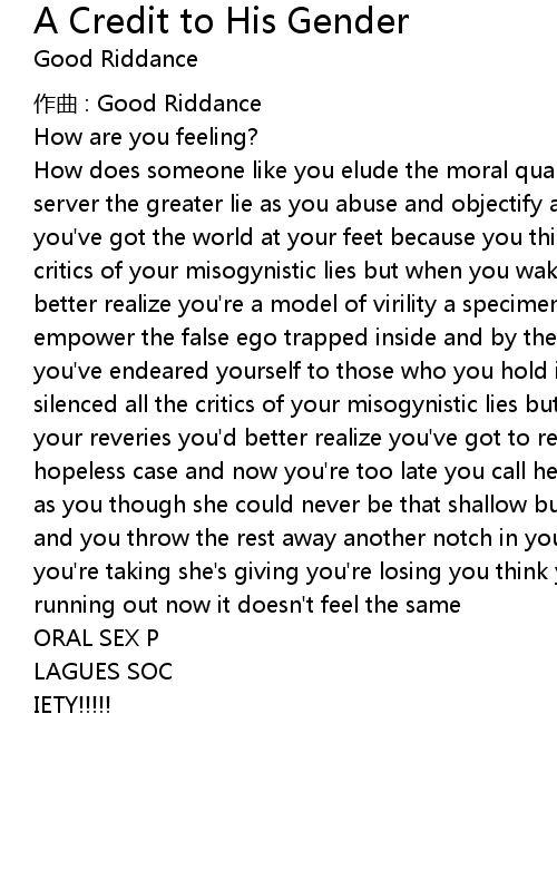 | How does someone like you elude the moral quarantine does your repression only server the greater lie as you abuse and objectify all the emotions you defeat you' ve got the world at your feet because you think you' ve silenced all the critics of your misogynistic lies but when you wake up from your reveries you' d better realize you' re a model of virility a specimen divine as you deflower you empower the false ego trapped inside and by the virtue of your " conquests" you' ve endeared yourself to those who you hold in high esteem you think you' ve silenced all the critics of your misogynistic lies but when you wake up from your reveries you' d better realize you' ve got to rectify that attitude you' re a hopeless case and now you' re too late you call her a whore she' s just the same as you though she could never be that shallow but you just take what you can get and you throw the rest away another notch in your belt another score another lay you' re taking she' s giving you' re losing you think you' re winning you' re time is running out now it doesn' t feel the same | |