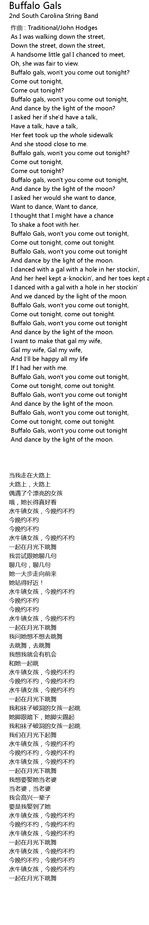 | [02:34.907] | Buffalo Gals, won' t you come out tonight |