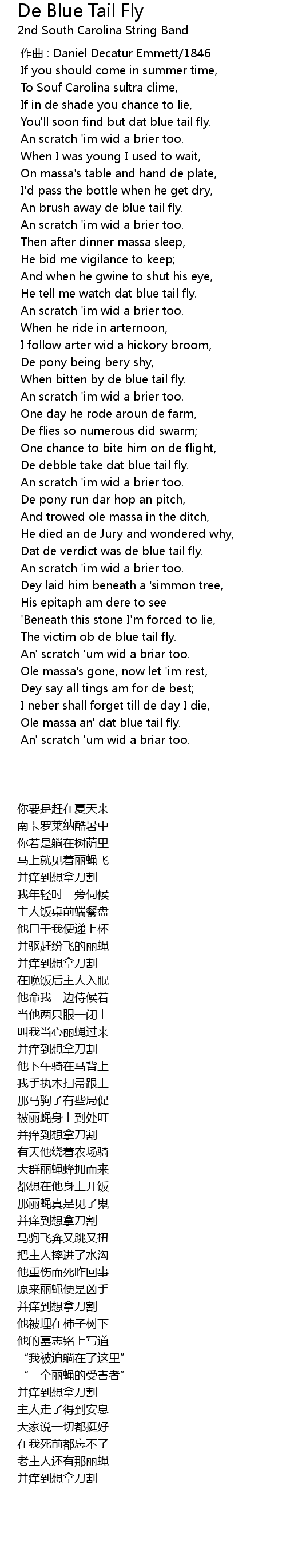 | [00:48.369] | You' ll soon find but dat blue tail fly. |