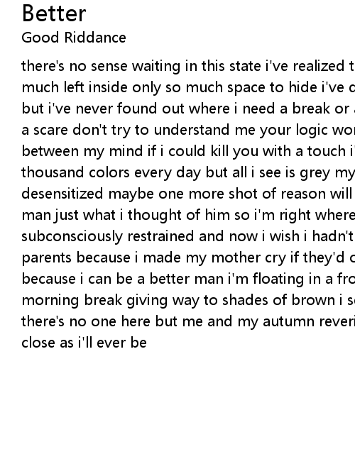 there's no sense waiting in this state i've realized too late there's only so much left inside only so much space to hide i've dreamed of castles in the air but i've never found out where i need a break or a vacation before i give myself a scare don't try to understand me your logic won't command me don't try to read between my mind if i could kill you with a touch i'd never hate this much one thousand colors every day but all i see is grey my history is plagiarized i feel desensitized maybe one more shot of reason will ripple this disguise i told that man just what i thought of him so i'm right where i am tied to this bed subconsciously restrained and now i wish i hadn't said what i said to both of my parents because i made my mother cry if they'd only wait i'll make it up to them because i can be a better man i'm floating in a frozen sea i'll watch the morning break giving way to shades of brown i see the colors all around for once there's no one here but me and my autumn reverie and in my heart i know it's as close as i'll ever be