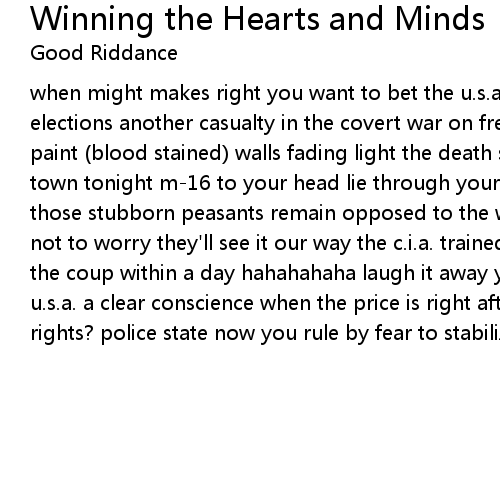 when might makes right you want to bet the u.s.a. is now a terrorist threat free elections another casualty in the covert war on freedom and democracy spray paint (blood stained) walls fading light the death squads are coming to your town tonight m-16 to your head lie through your teeth or you might end up dead those stubborn peasants remain opposed to the western puppet that we've imposed not to worry they'll see it our way the c.i.a. trained death squads will crush the coup within a day hahahahaha laugh it away you're making friends with the u.s.a. a clear conscience when the price is right after all who needs human rights? police state now you rule by fear to stabilize this hemisphere for what?