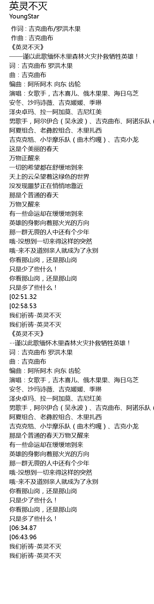 | [03:46.82] | --谨以此歌缅怀木里森林火灾扑救牺牲英雄! |