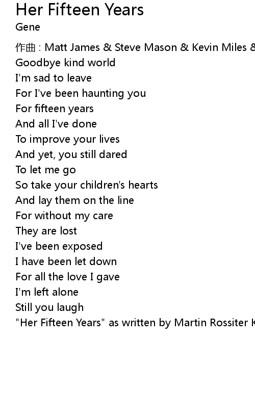 | " Her Fifteen Years" as written by Martin Rossiter Kevin Miles |