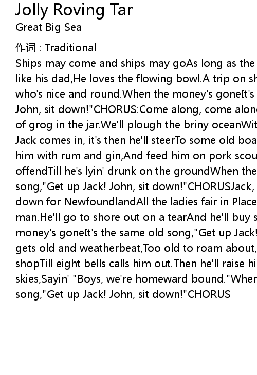 | Ships may come and ships may goAs long as the sea does roll. Each sailor lad just like his dad, He loves the flowing bowl. A trip on shore he does adoreWith a girl who' s nice and round. When the money' s goneIt' s the same old song," Get up Jack! John, sit down!" CHORUS: Come along, come along, You jolly brave boys, There' s lots of grog in the jar. We' ll plough the briny oceanWith the jolly roving tar. When Jack comes in, it' s then he' ll steerTo some old boarding house. They' ll welcome him with rum and gin, And feed him on pork scouse. He' ll lend, spend and he' ll not offendTill he' s lyin' drunk on the groundWhen the money' s goneIt' s the same old song," Get up Jack! John, sit down!" CHORUSJack, he then, oh then he' ll sailBound down for NewfoundlandAll the ladies fair in Placentia thereThey love that sailor man. He' ll go to shore out on a tearAnd he' ll buy some girl a gown. When the money' s goneIt' s the same old song," Get up Jack! John, sit down!" CHORUSWhen Jack gets old and weatherbeat, Too old to roam about, They' ll let him stop in some rum shopTill eight bells calls him out. Then he' ll raise his eyes up to the skies, Sayin' " Boys, we' re homeward bound." When the money' s goneIt' s the same old song," Get up Jack! John, sit down!" CHORUS |