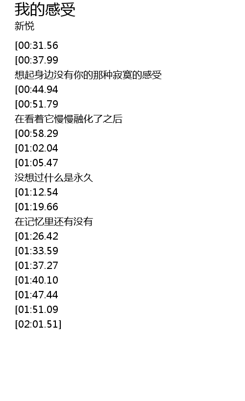 | [02:22.21][00:37.99] | 霓虹灯下午夜时候 想起身边没有你的那种寂寞的感受 |