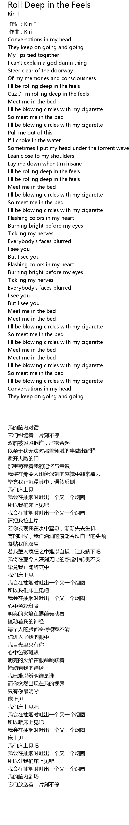 | [00:34.67] | I' ll be rolling deep in the feels |
