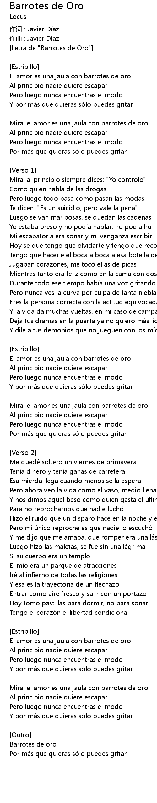 | Letra de " Barrotes de Oro" | |
