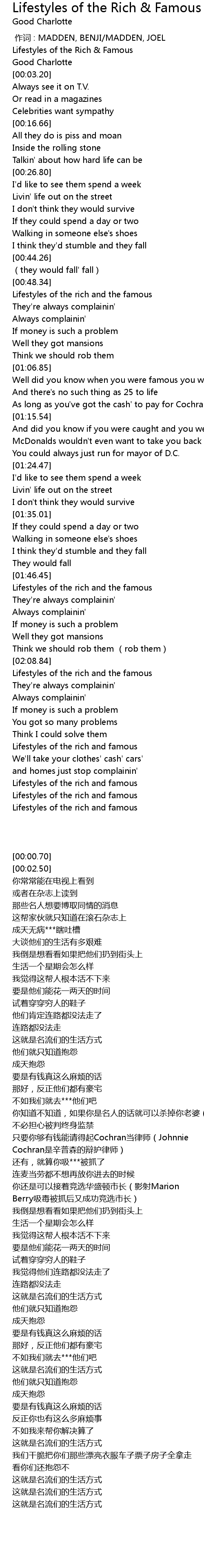| [02:56.23] | Lifestyles of the rich and famous |