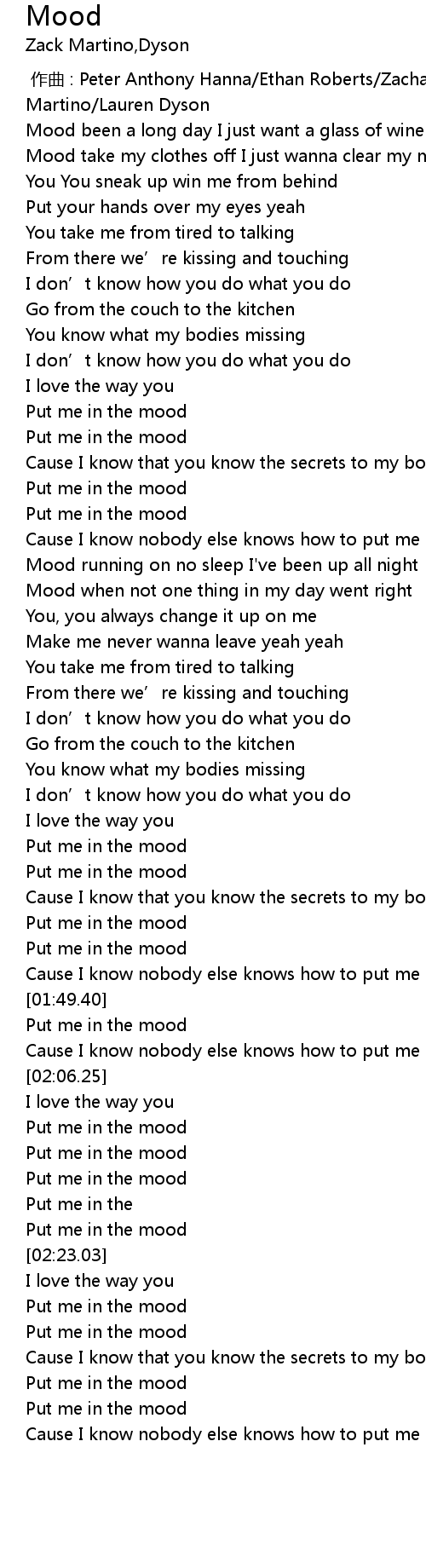 | [02:43.17] | Cause I know nobody else knows how to put me in the mood |
