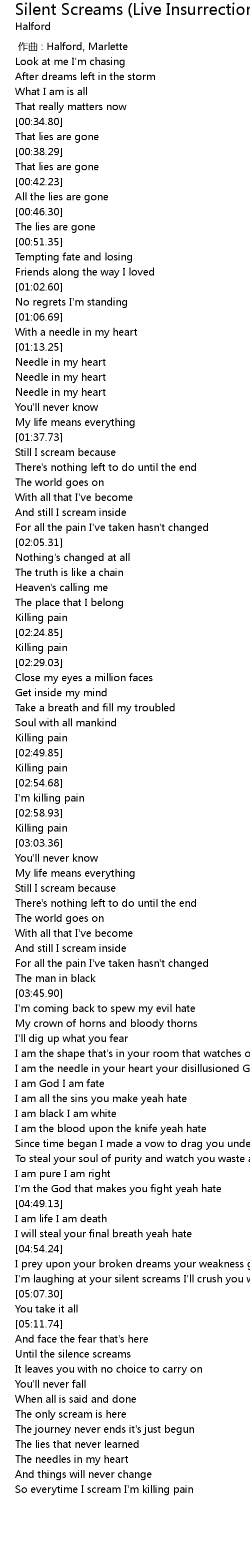 | [05:00.17] | I' m laughing at your silent screams I' ll crush you with my hate yeah |