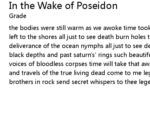 the bodies were still warm as we awoke time took past away we dragged what was left to the shores all just to see death burn holes through the black depths in deliverance of the ocean nymphs all just to see death burn holes through the black depths and past saturn's' rings such beautiful things these screaming voices of bloodless corpses time will take that away come to me with the tales and travels of the true living dead come to me legends, gods and mystery as my brothers in rock send secret whispers to thee legends, gods, and mystery |