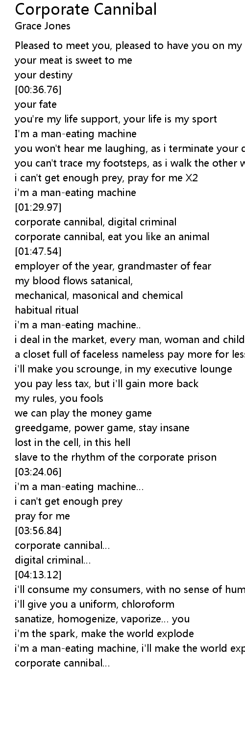 | [01:41.78] | corporate cannibal, eat you like an animal |