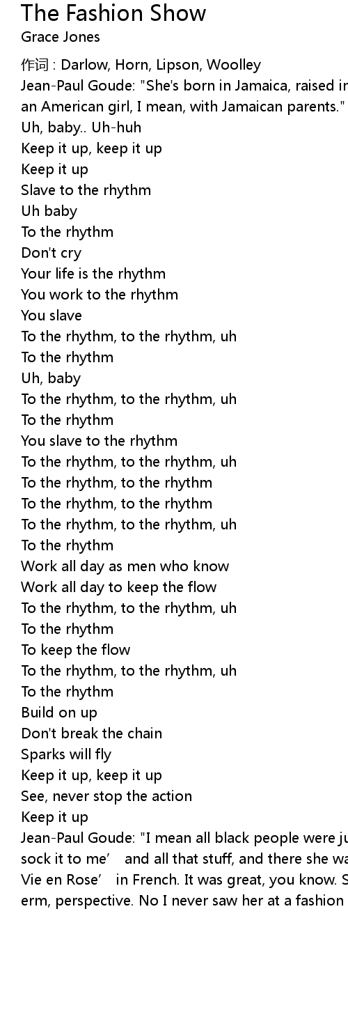 | JeanPaul Goude: " I mean all black people were just, you know ' do it to me, sock it to me' and all that stuff, and there she was, you know, singing ' La Vie en Rose' in French. It was great, you know. So I thought what a wonderful, erm, perspective. No I never saw her at a fashion show." |