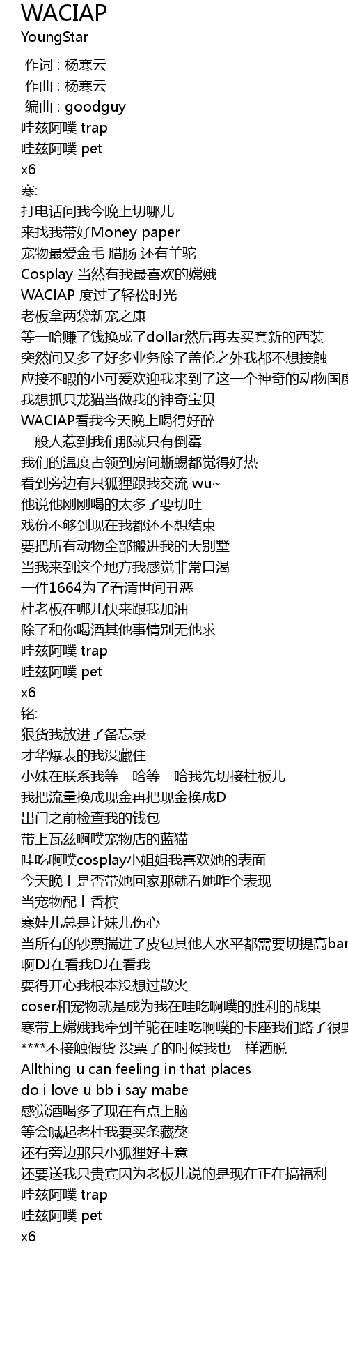 | [02:02.763] | 寒带上嫦娥我牵到羊驼在哇吃啊噗的卡座我们路子很野啥子都耍过只接触real ****不接触假货 没票子的时候我也一样洒脱 |