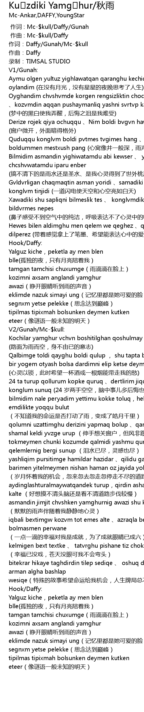 | [00:26.937] | Quduqqu konglvm boldi pvtmes tvgimes hang 、yamghurnig xush awazidin boldummen mestxush pang (心窝像井一般深,雨声使我陶醉) |