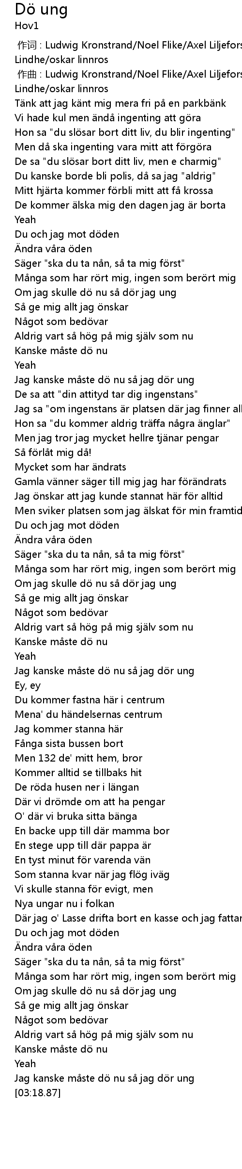 | [02:59.82] | Om jag skulle dö nu så dör jag ung |
