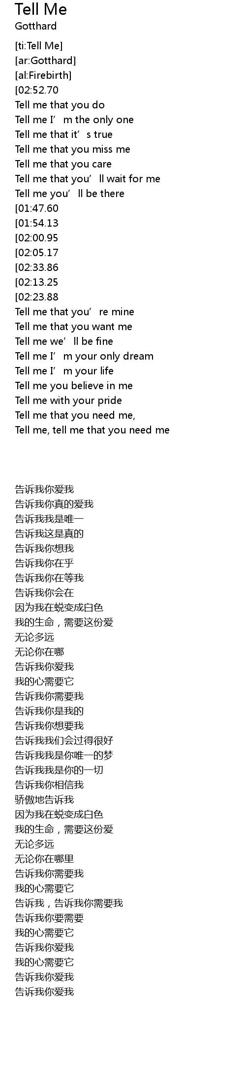 | [00:14.82][02:52.70][02:59.44] | Tell me that you love me |