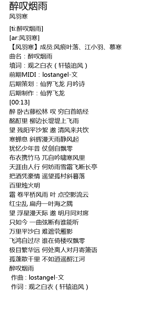 | [00:22] | 酩酊里 柳边长堤堤上飞雨 |