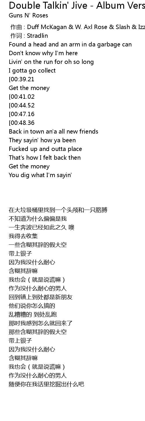| [01:05.58][00:39.21] | Double talkin' jive |