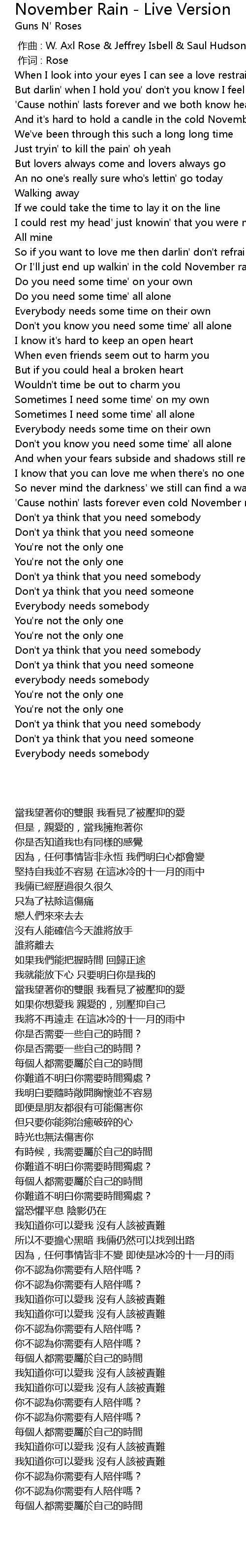 | [09:23.800] | 'Cause nothin' lasts forever even cold November rain |