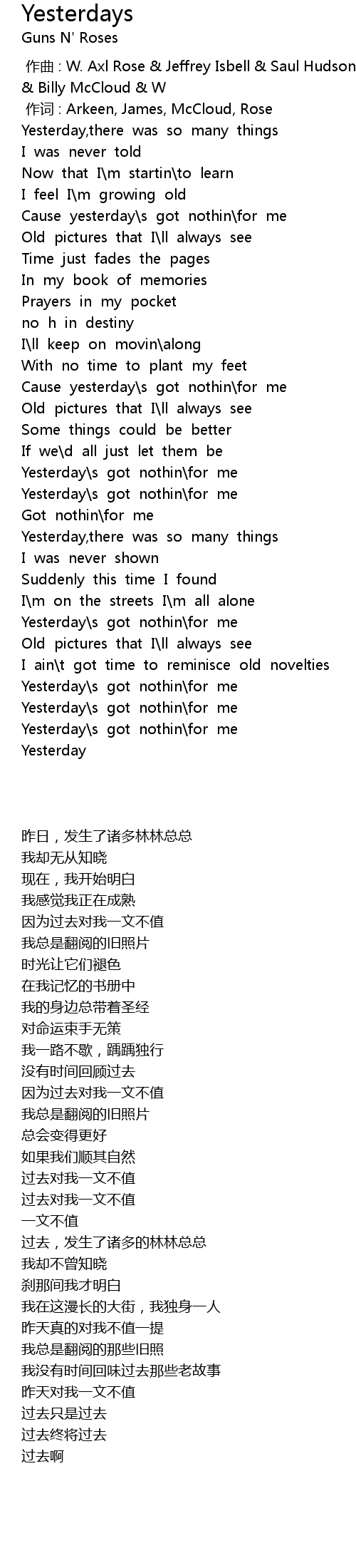 | [02:18.09] | Yesterday\s got nothin\for me |