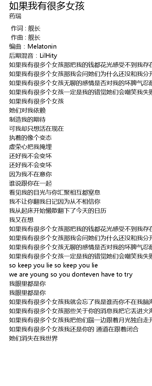 | [00:40.559] | 如果我有很多个女孩那我会问她们为什么还没和我分开 |