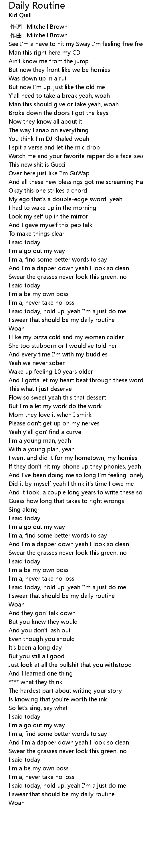 | [00:10.71] | See I'm a have to hit my Sway I'm feeling free free, woah |