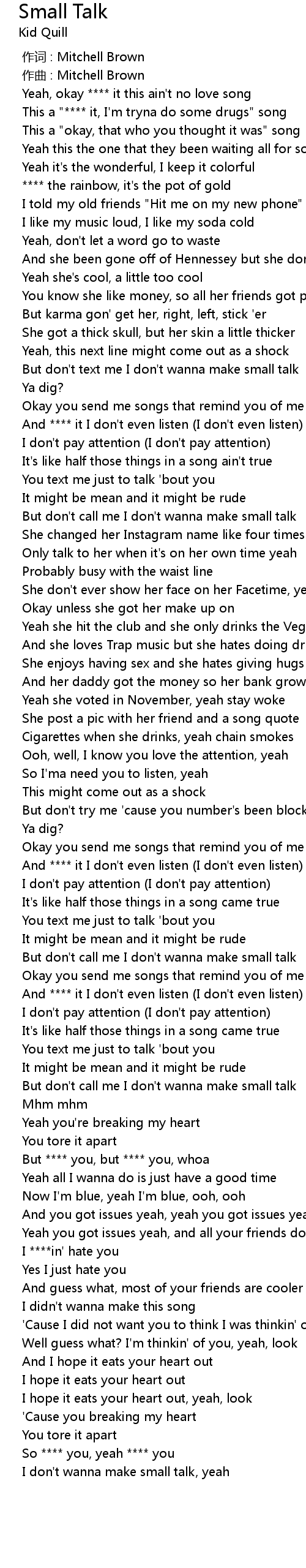| [02:21.013] | But don' t call me I don' t wanna make small talk |