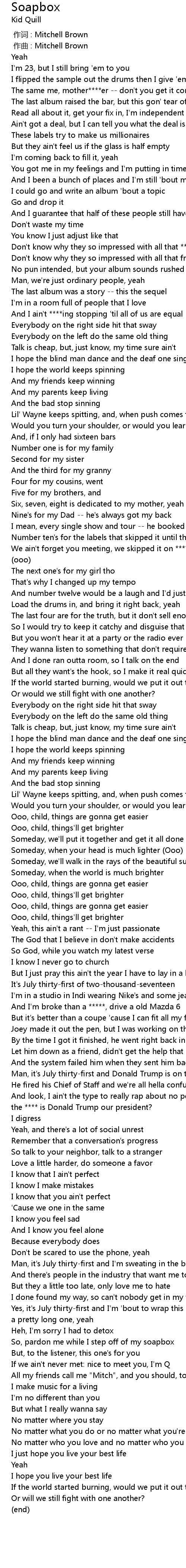 | [04:42.35] | And look, I ain't the type to really rap about no politics, but how the **** is Donald Trump our president? |