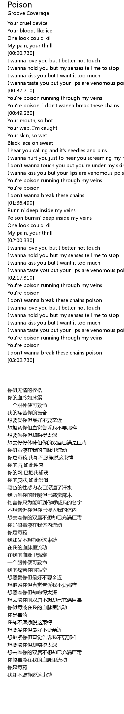 | [00:31.670] | I wanna taste you but your lips are venomous poison |