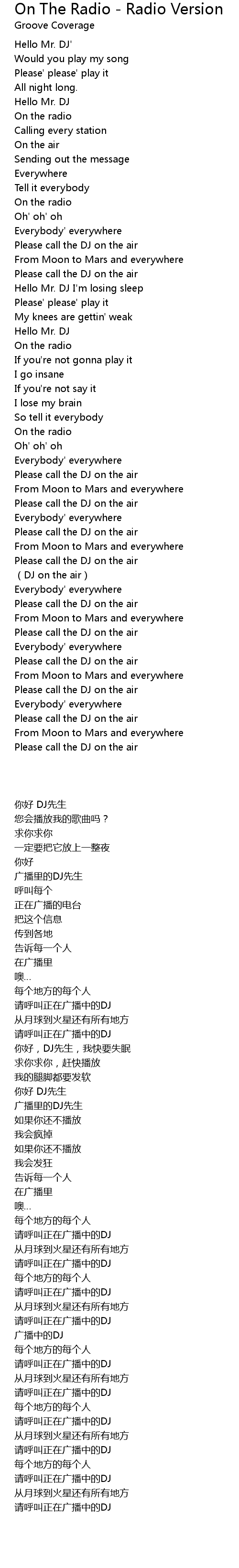 | [01:05.780] | Hello Mr. DJ I' m losing sleep |