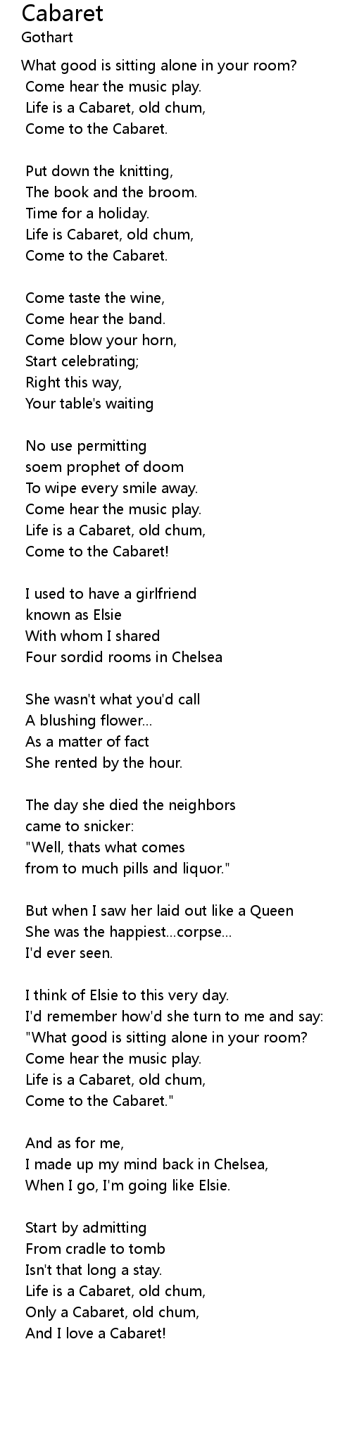 | Life is a Cabaret, old chum, | |