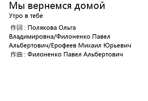 | [00:00.000] | 作词 : Полякова Ольга Владимировна/Филоненко Павел Альбертович/Ерофеев Михаил Юрьевич |