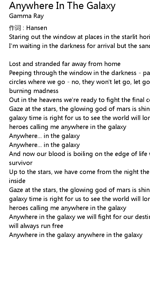 | Gaze at the stars, the glowing god of mars is shinning for us, anywhere in the galaxy time is right for us to see the world will long for liberty the fallen heroes calling me anywhere in the galaxy | |