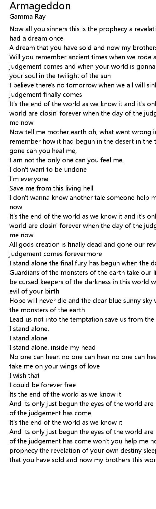 It's the end of the world as we know it and it's only just begun the eyes of the world are closin' forever when the day of the judgement will come won't you help me now